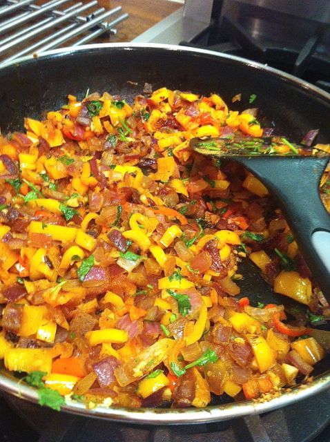 Then I sautéed a bunch of onions and small sweet peppers with olive oil, cumin, turmeric, chile powder, sea salt and black pepper, a dash of red pepper flakes and then added some grated garlic cloves. Check out this pan of lusciousness! ( I added a little fresh cilantro in as well – I thought it would be much prettier in the picture:)