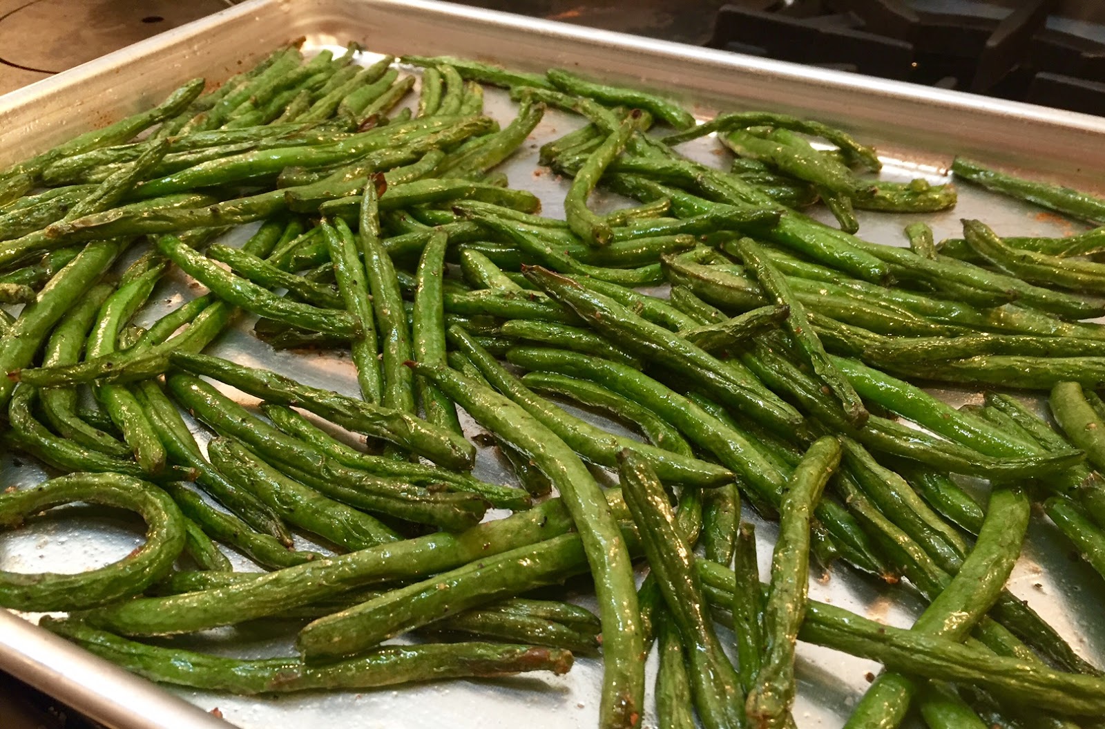 Step Two While the oven and pan are heating, Toss the green beans in a bowl with the olive oil and salt and pepper. Using an oven-proof mitt or potholder carefully remove the pan from the oven. Scatter the beans on the hot sheet pan and place back in the oven for 10 minutes or until green beans are browned on the edges