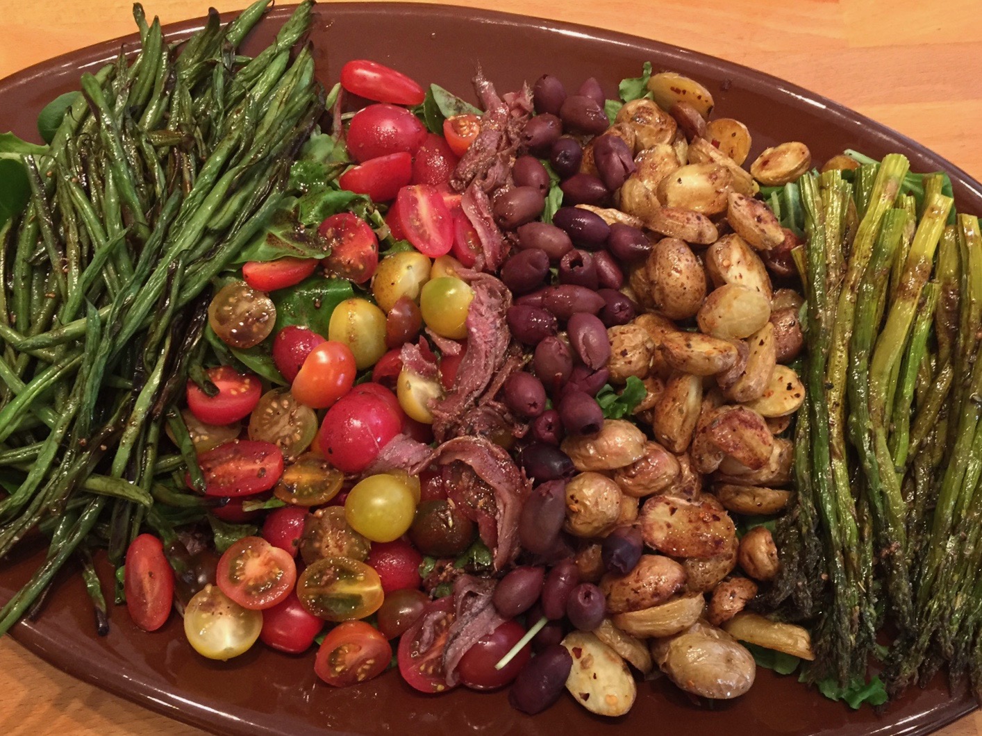 For the picture above we roasted green beans and asparagus, baby gold potatoes and mushrooms…but the combinations are limited only by your imagination, Make sure to include some fresh veggies to add a crispy contrast to the roasty toasty flavors. We used grape tomatoes that we halved, but shallots, green onions, carrots, celery, fennel or sliced bell peppers would all be tasty, too.