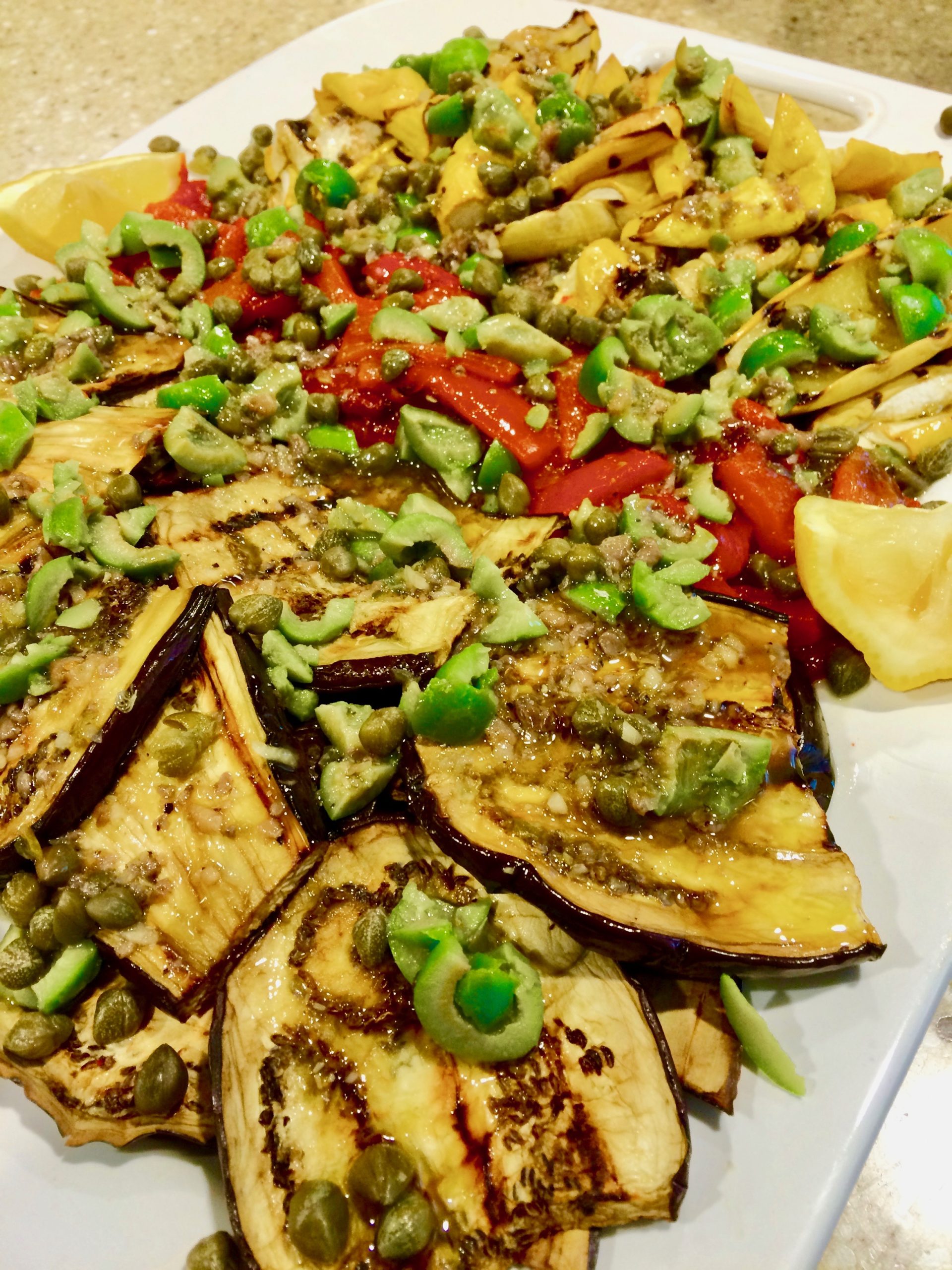Grilled Veggies with Mediterranean Almond Caper Olive Sauce