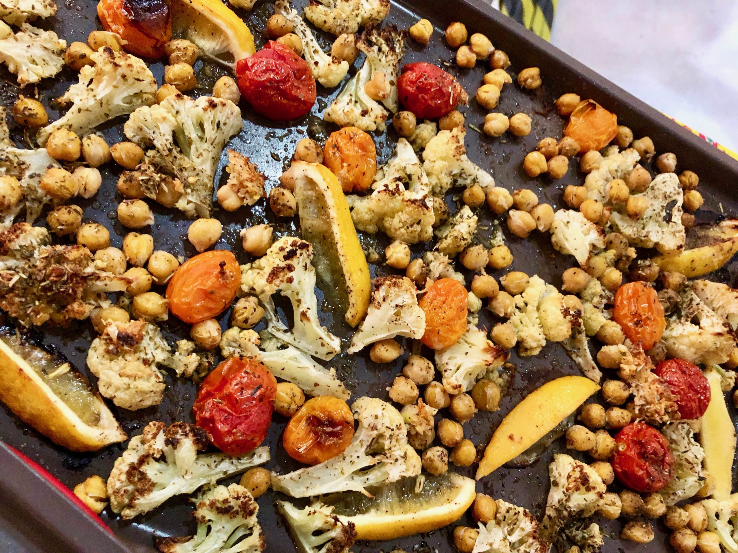 Preheat the oven to 450F. Line a baking sheet with the nonstick foil and spray or drizzle with 1 TB olive oil. Toss the garlic cloves, salt, pepper, cauliflower, tomatoes, chickpeas, lemons and Italian seasoning together on the sheet tray. Roast in the oven until veggies are cooked through and browned on the