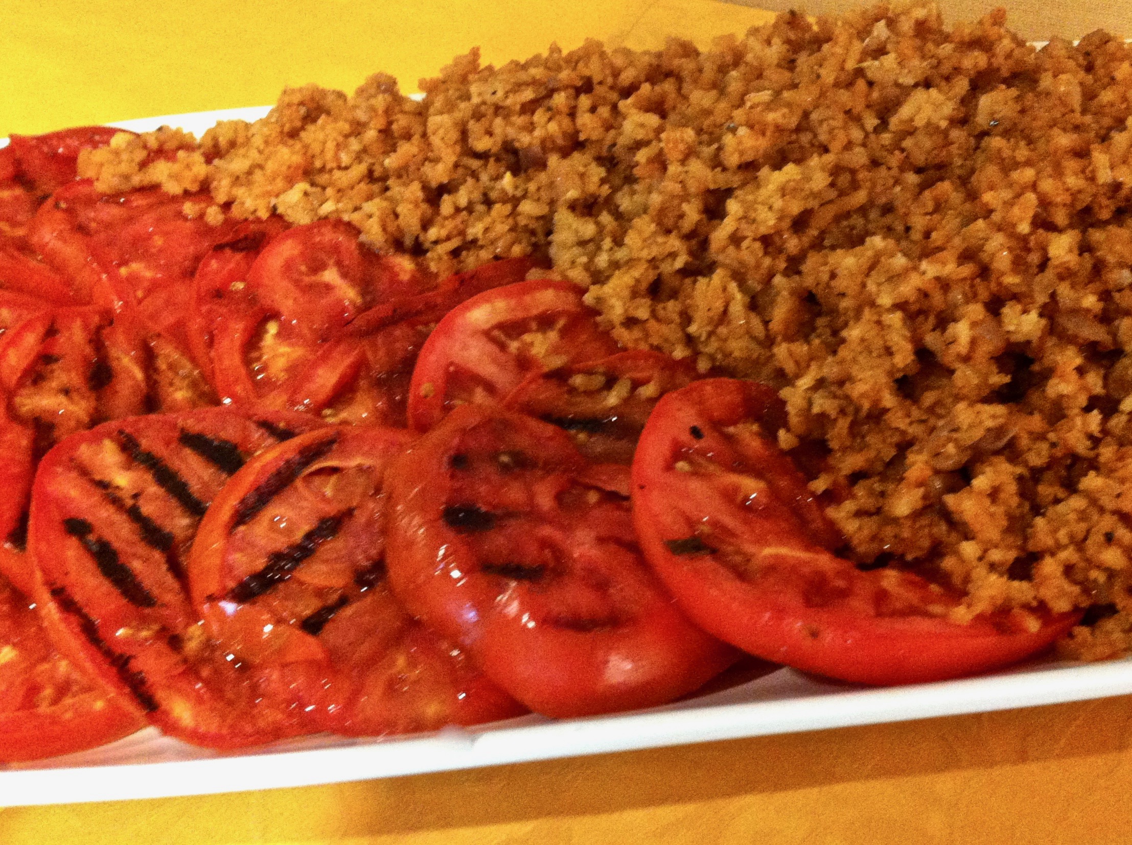 We are still getting big beautiful beefsteak tomatoes here in Georgia. We can’t resist passing on this gorgeous and easy side. Funny to say – but true – if you can boil rice you can make this flavorful, colorful and delicious side dish, inspired by bright cuisines of the Mediterranean. Tomatoes and peppers are an important part of warm weather foods, and this recipe includes both. The garlic and red onion are full of antioxidants, and although we usually use brown rice in our recipes, we are staying close to the original by using a short-grained rice called Valencia or Paella rice. The list of other items in this recipe helps balance the white rice and add extra nutrition!