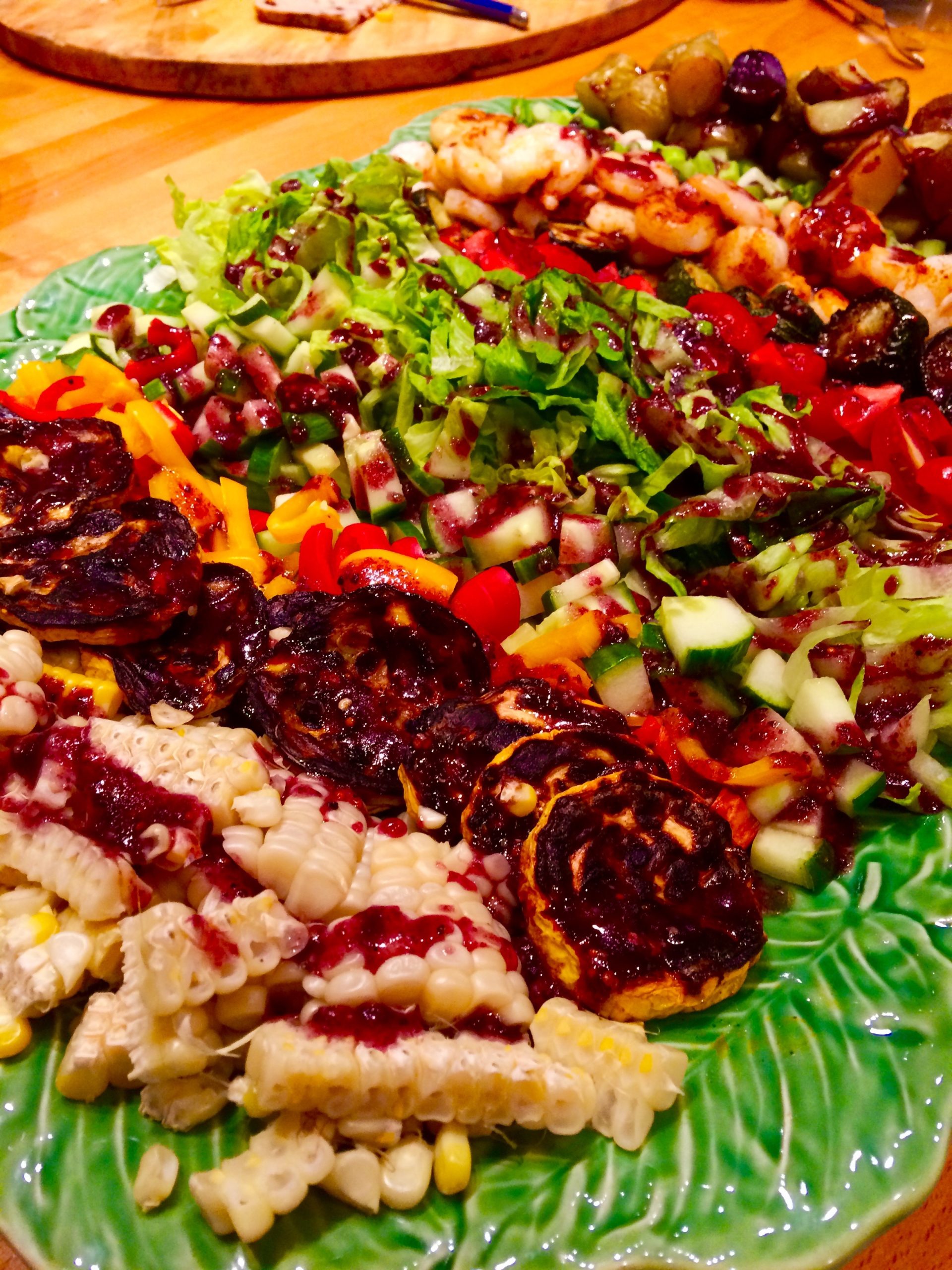 Father’s Day kicks off the official grilling season most everywhere – and there’s nothing better from the grill than seasonal veggies. Here’s a way to serve up those delicious veggies that is not only appetizing – but beautiful. Basil is a great accompaniment to grilled produce. It adds a mild spicy zing and a wonderful aroma. You can even make it a meal by adding in some grilled shrimp like we did in the photo!