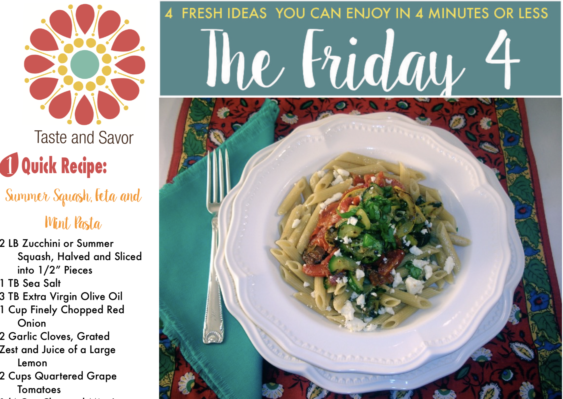 Friday Four 070519: Summer Squash, Feta and Mint Pasta