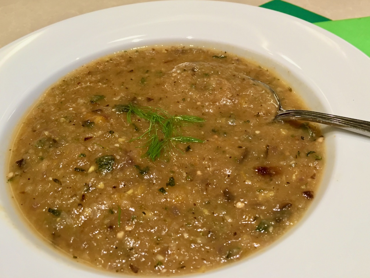 When the chickpeas have finished cooking, remove about 2 cups from the pot and set aside. Add the remaining chickpeas to the pot, (draining any excess liquid), and using the immersion blender, puree the soup. Add in the chickpeas that have been set aside, the spinach and stir in the red pepper flakes. Warm over low heat and serve with a garnish of fennel fronds.