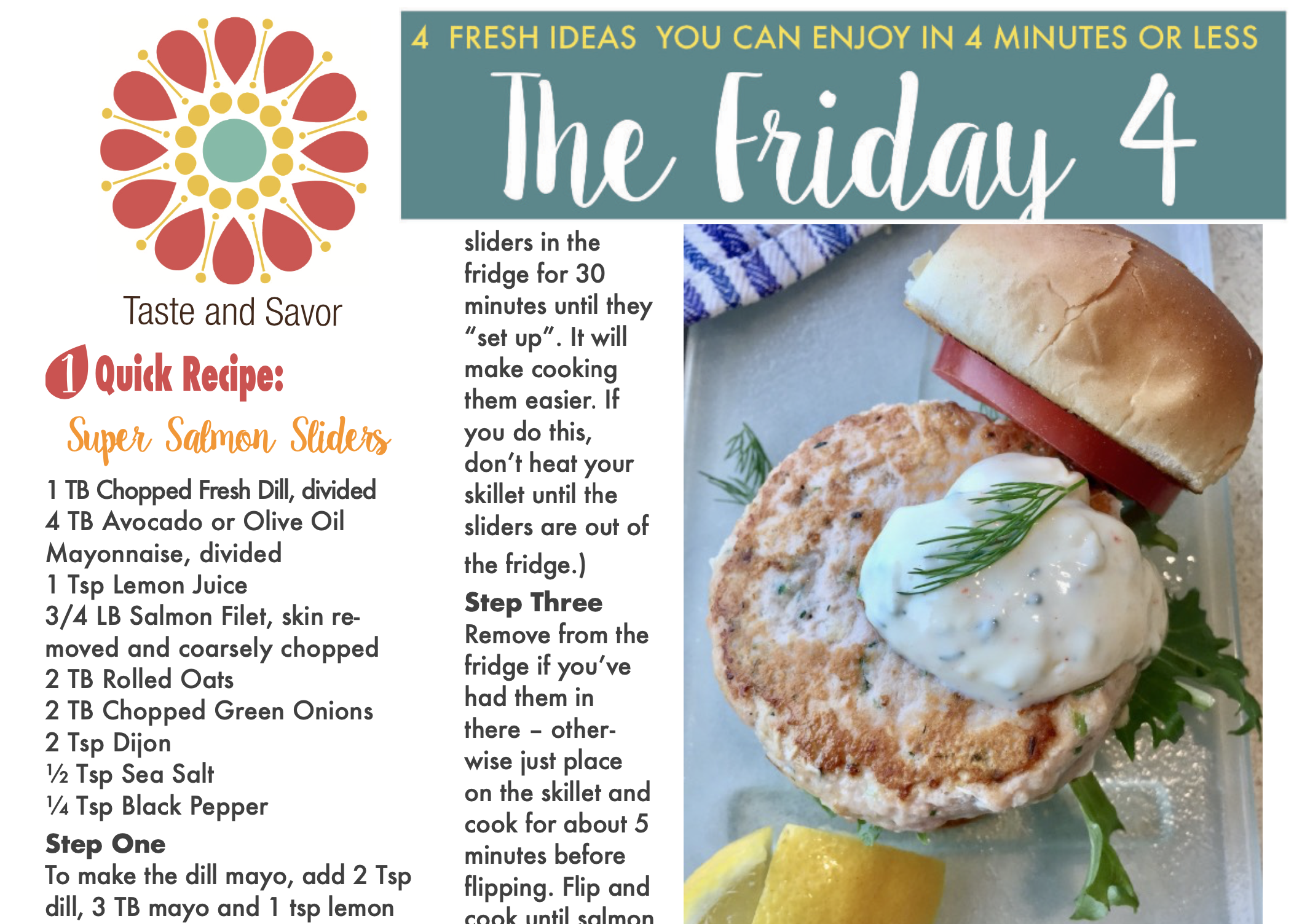 Heat a cast iron skillet, non stick skillet or a griddle on medium heat and spray with oil. Combine the remaining dill and mayo, the salmon, oats onions, and Dijon in a food processor and use the pulse feature until everything is fully mixed. Shape salmon mixture into 4 – 6 sliders. (If you have time, you may want to place your sliders in the fridge for 30 minutes until they “set up”. It will make cooking them easier. If you do this, don’t heat your skillet until the sliders are out of the fridge.)