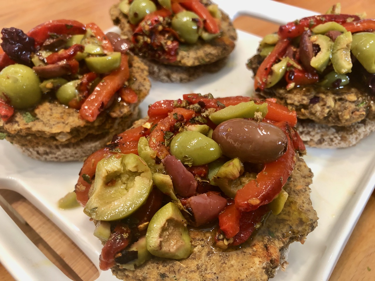 Step Three Place the burgers on a parchment lined sheet tray. Slide into a 350F oven and cook until warmed through – about 15 minutes, flipping half way thru cooking. Serve open faced on a slice of rustic bread and top with *Quick and Rustic Olive Salsa