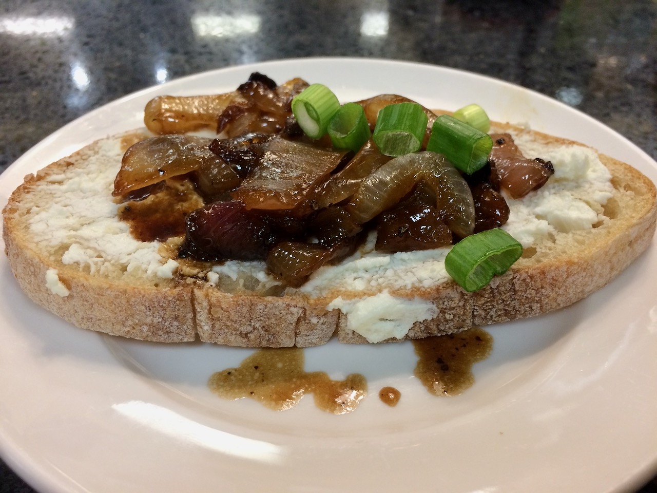 Heat the oil in a saucepan over medium heat. Add the Vidalia onion and red onion; cook, stirring, until soft, about 15 to 20 minutes, reducing heat to low as onions soften. Add the vinegar, honey and salt and pepper to taste and heat through, 2 to 3 more minutes. Either toast your bread in the oven or a toaster. As soon as it lightly golden, spray with the olive oil and rub with the garlic clove. Spread a generous TB of goat cheese on each slice and top the bread with the onions and garnish with the green onions