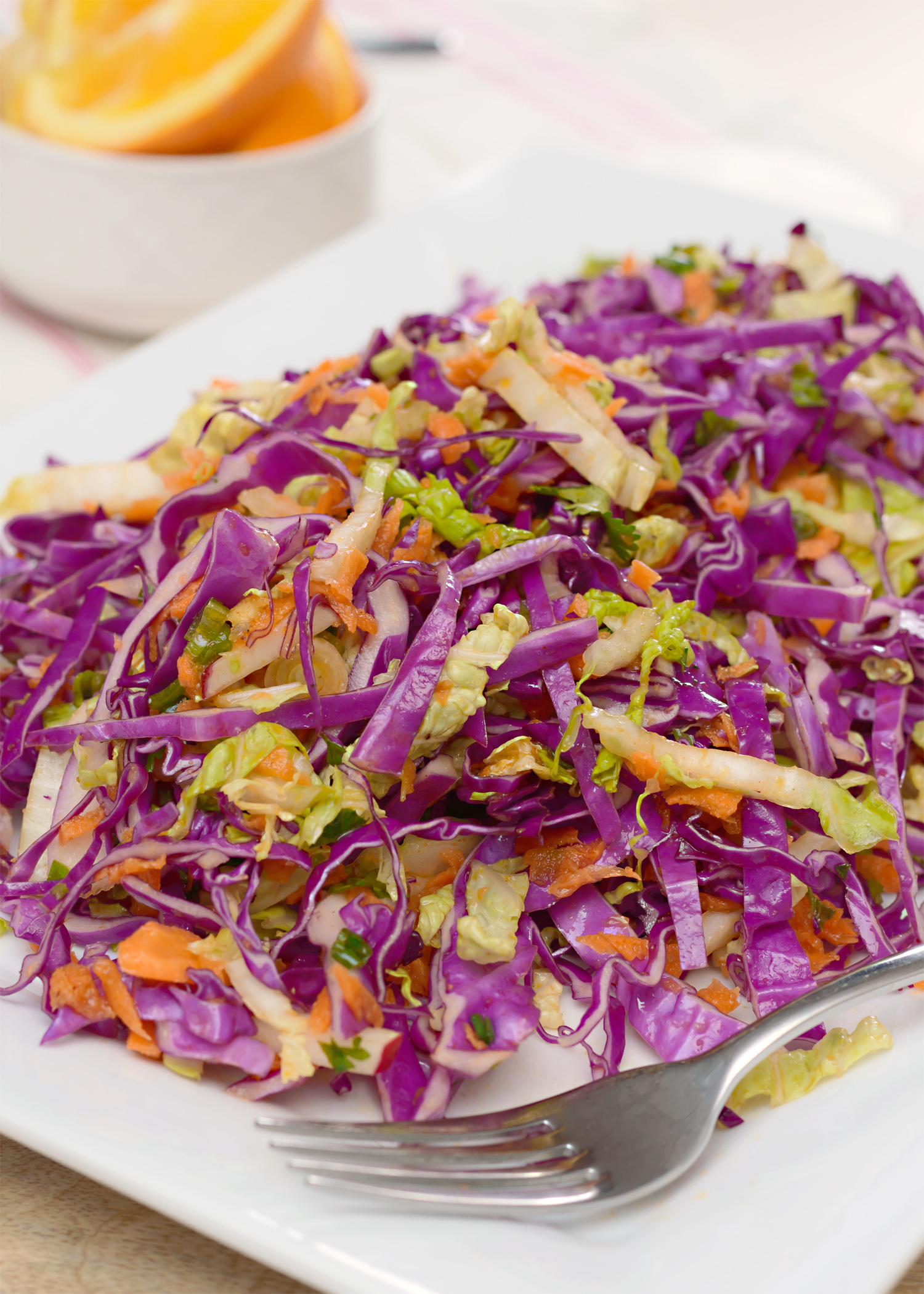There’s nothing like warm weather to inspire the “coleslaw” in us! This one is a yummy blend of cabbages, radishes, carrots and orange. And the perfect partner to zesty orange is basil.