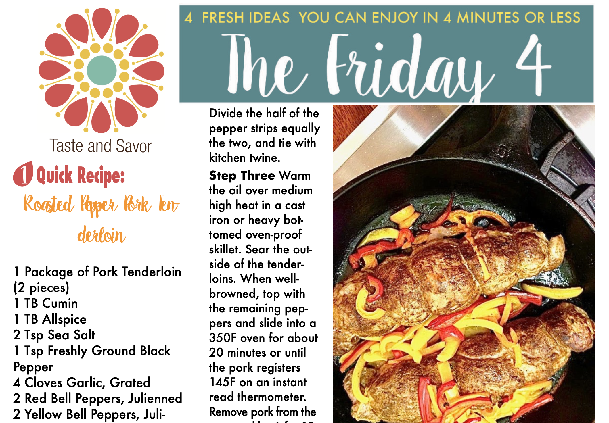 Warm the oil over medium high heat in a cast iron or heavy bottomed oven-proof skillet. Sear the outside of the tenderloins. When well-browned, top with the remaining peppers and slide into a 350F oven for about 20 minutes or until the pork registers 145F on an instant read thermometer. Remove pork from the oven and let sit for 15 minutes on the counter. Remove the strings and slice to serve.