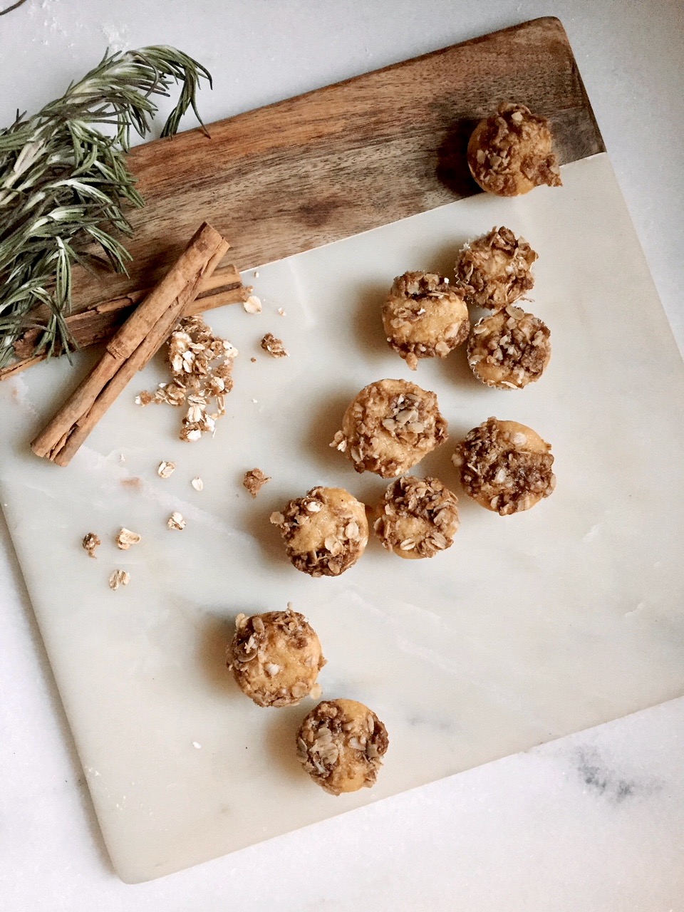 Fill greased mini muffin cups 3/4 of the way full. Sprinkle each muffin topping. Bake for 10 minutes or until a toothpick stuck in the middle comes out clean. Let cool for 5 minutes. Makes about 24 mini muffins