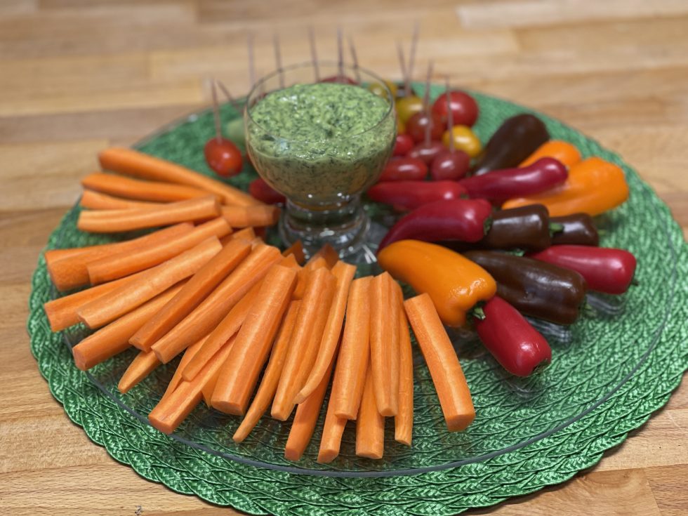How about an easy, light and creamy green way to celebrate spring weather? Top any salad with this yumminess – or use it for dipping crunchy fresh veggies like we have done in the photo above.