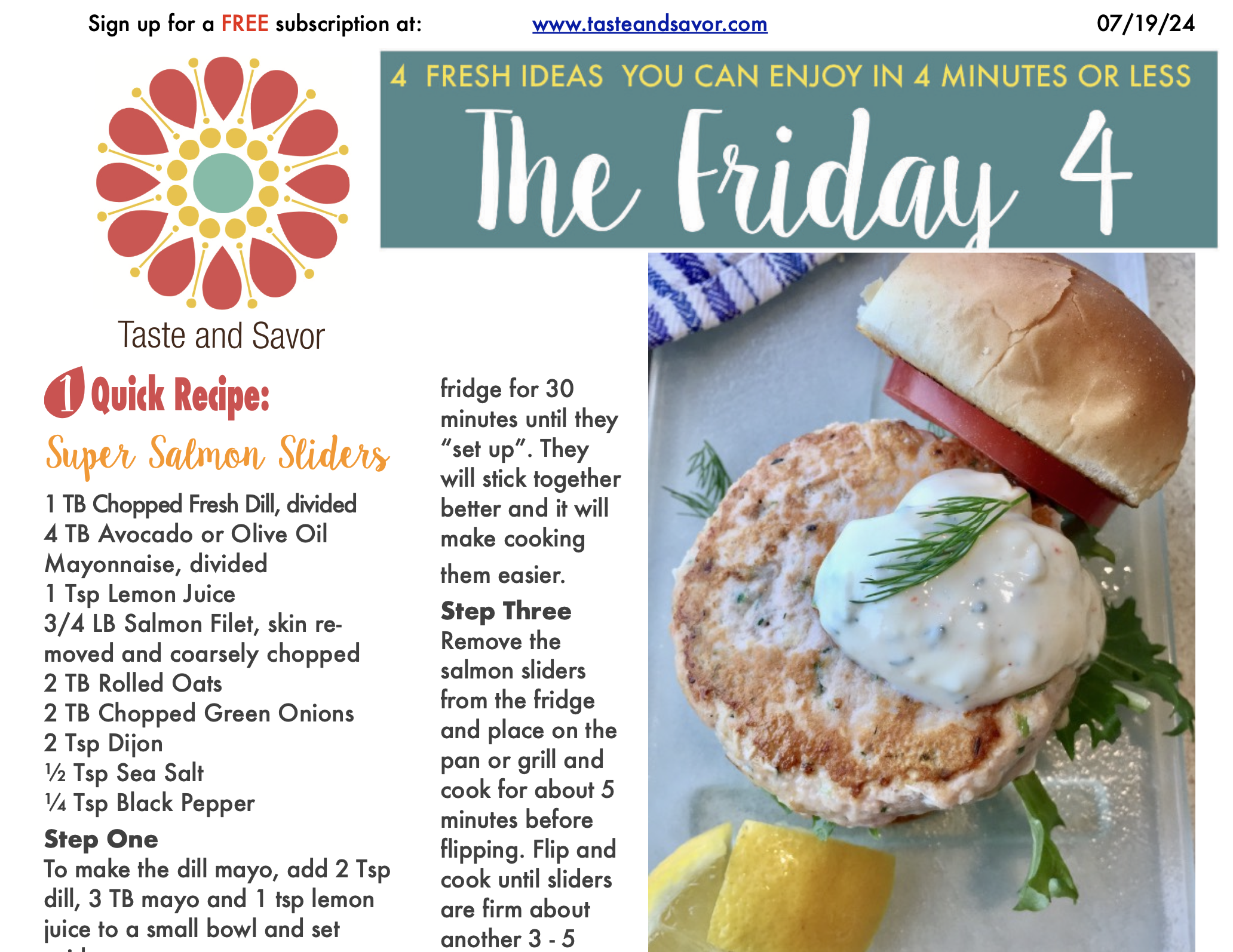 Heat a cast iron skillet, grill pan or very clean grill on medium heat and coat the pan or grill with oil. Combine the remaining dill and mayo, the salmon, oats onions, and Dijon in a food processor and use the pulse feature until everything is fully mixed. Shape salmon mixture into 4 – 6 sliders. Place your sliders in the fridge for 30 minutes until they “set up”. They will stick together better and it will make cooking them easier.