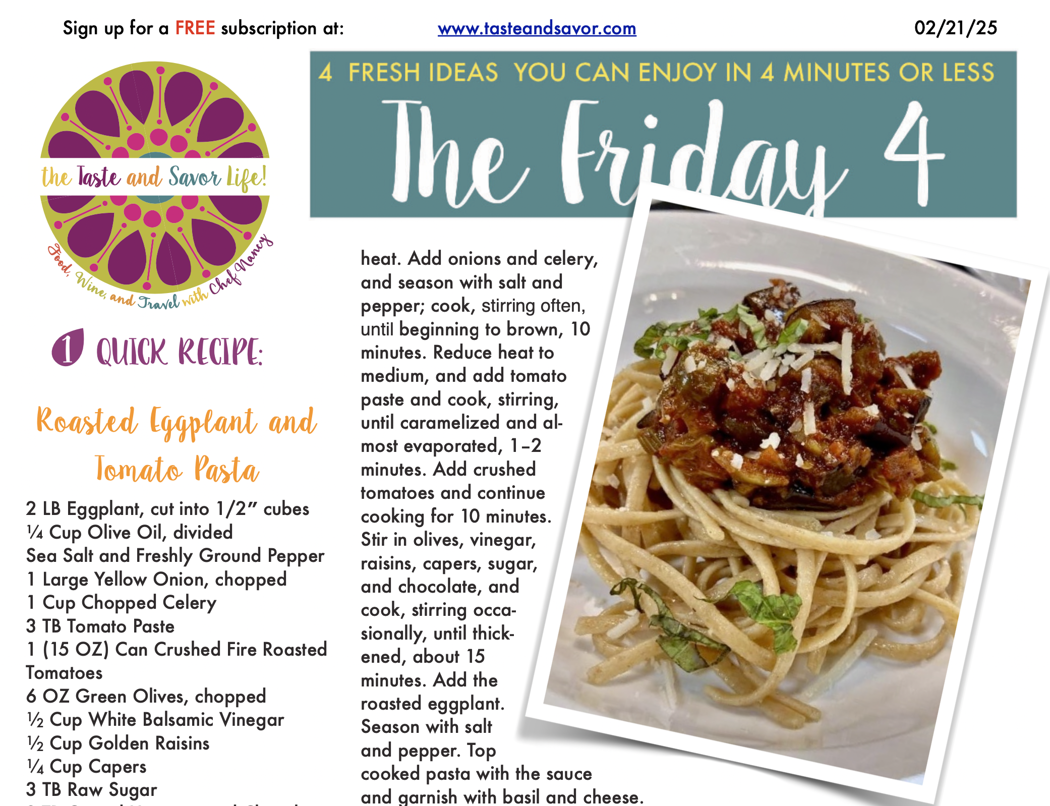 Friday Four – Roasted Eggplant and Tomato Pasta – 022125