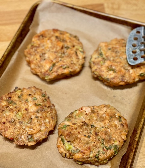 Combine the salmon, eggs, onions, bread crumbs, walnuts and juice. Use your hands to gently combine and form into 8 – 10 patties that are no more than 3⁄4 to 1” thick.
