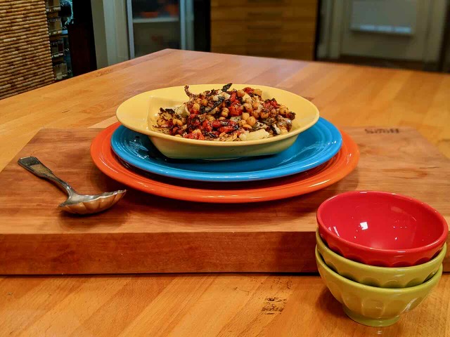 Preheat the oven to 400F. Line a baking sheet with parchment and spray or drizzle with 3 TB olive oil. Toss the garlic cloves, salt, pepper, cauliflower, tomatoes, sweet peppers, chickpeas, lemons and herbs together on the sheet tray. Roast in the oven until veggies are cooked through and browned on the edges. Stir in the chives and top ancient grains with the ratatouille. Drizzle with extra virgin olive oil and serve.
